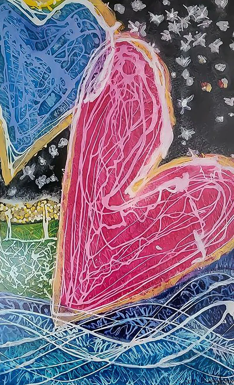 The piece was inspired by an evening of music, dancing, and beach life — an experience I would not have had without my new heart and my husband’s support. The overlapping forms suggest our hearts entwined and the presence of my donor’s spirit within the work.