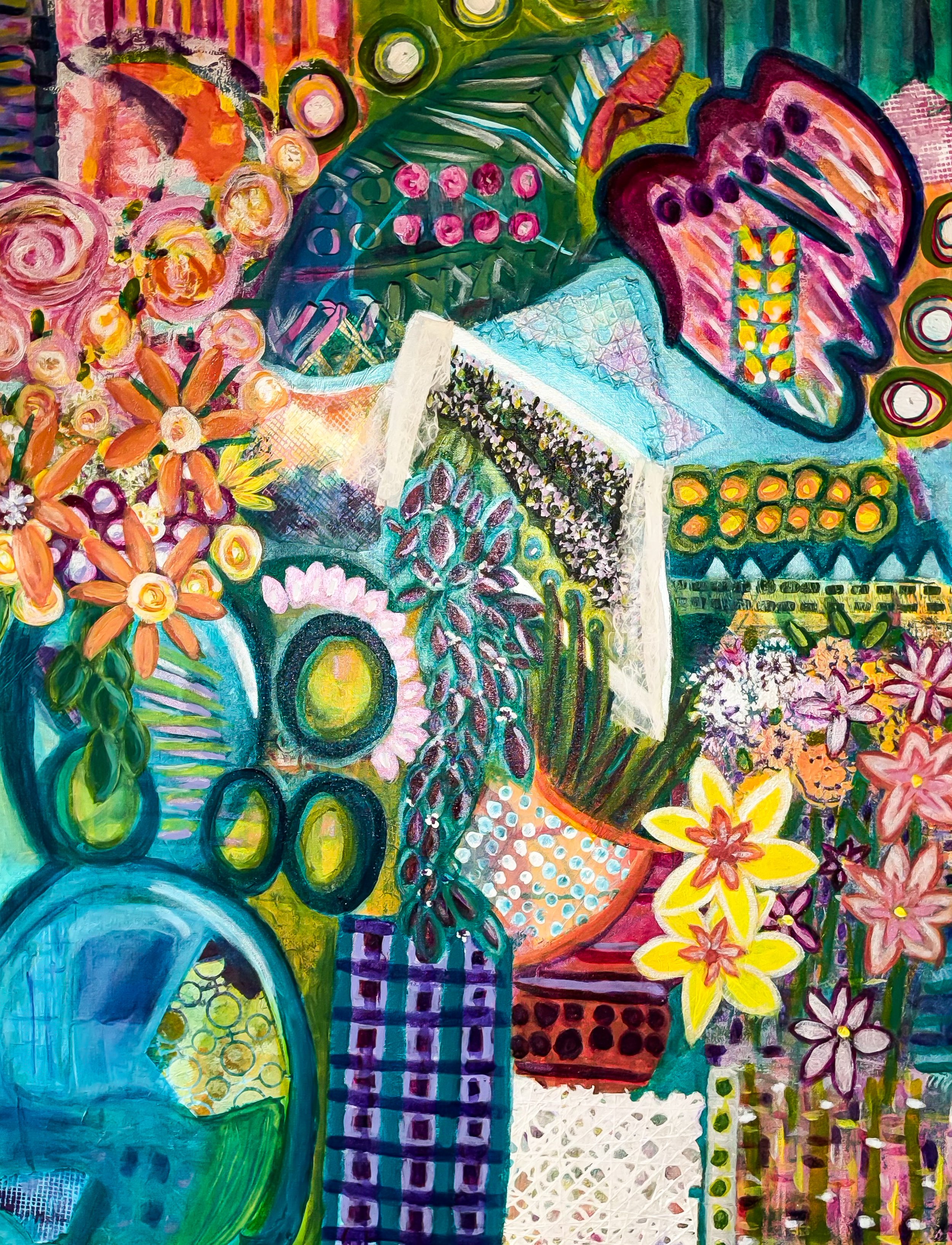 This painting, Ode to My Gifts (part of my personal collection), was created near the beginning of my return to art. It holds my gratitude for my organ donor, my family, and the renewed ability to fully embrace life and make art.
